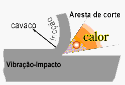 A aresta de corte corta o material e produz cavacos. A temperatura na ponta da aresta de